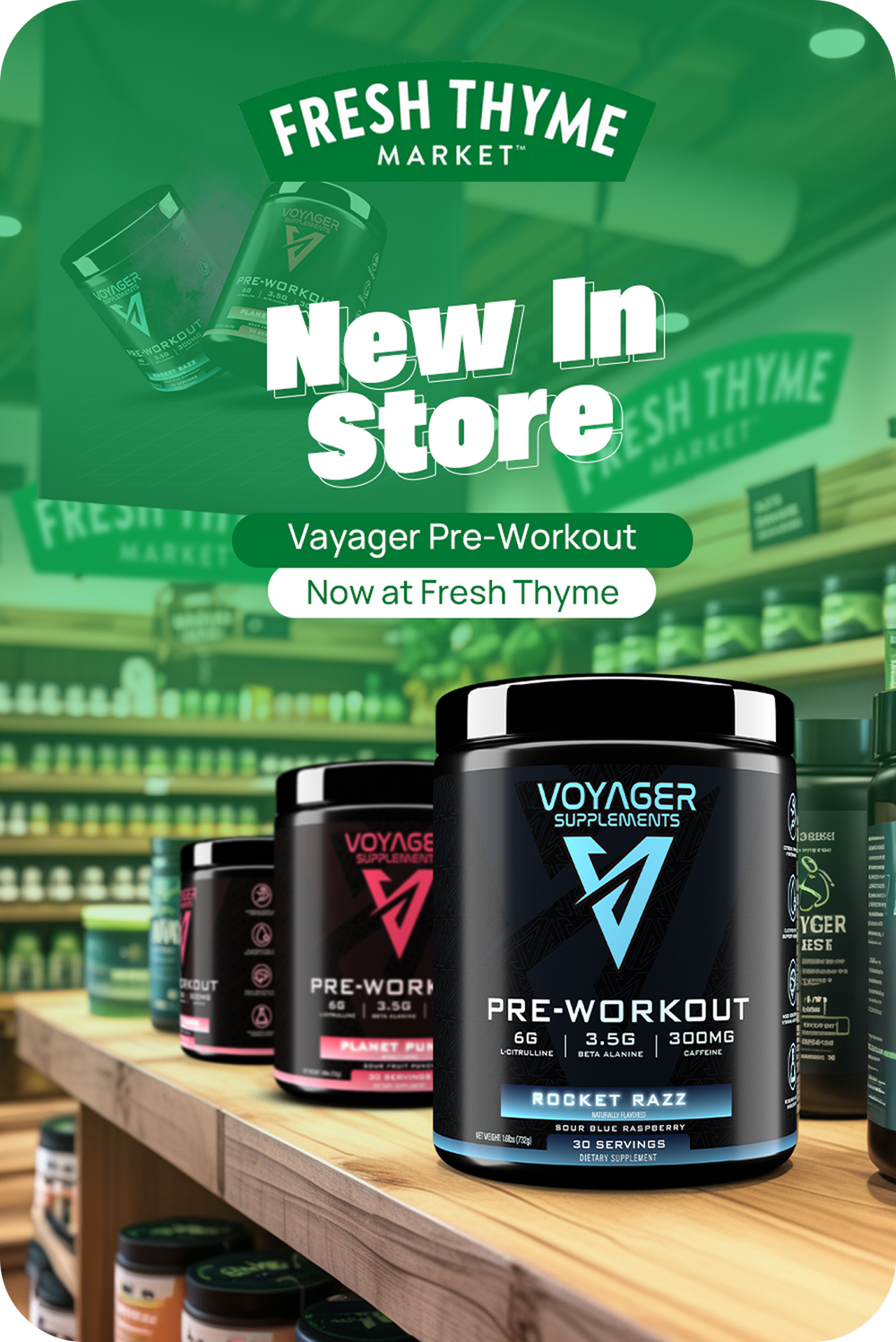 Fresh Thyme just got even fresher! You can now find Voyager Pre-Workout in all their stores. No shipping, no waiting—just grab, go, and get after it.